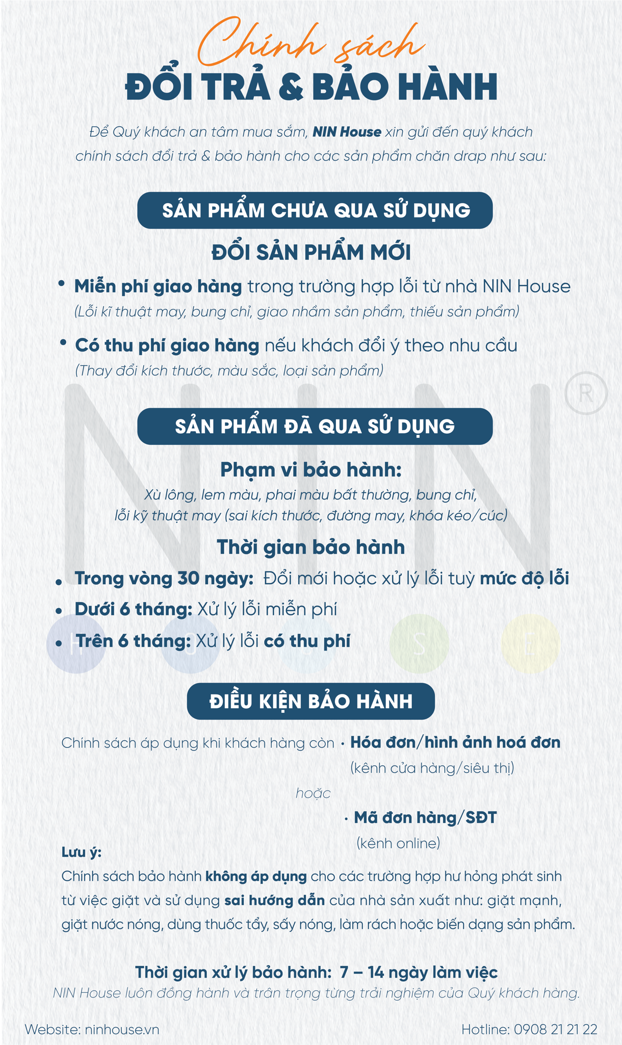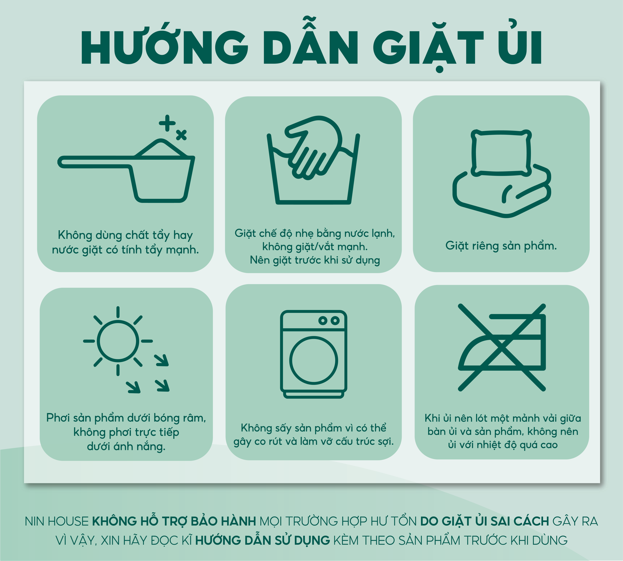 Vui lòng tuân thủ hướng dẫn làm sạch đi kèm được in trong tem phụ của chăn ga gối Nin House.